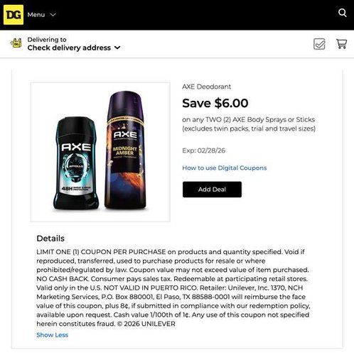 Found a Dollar General freebie with an in-store coupon. Clip the $6 off 2 coupon to your DG wallet and buy two AXE Phoenix Crushed Mint & Rosemary Deodorant Sticks (1.7oz). They’re $3 each, and the coupon makes them free. Expires 2/28.