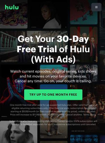 New and eligible returning users can get 30 days of Hulu (with ads) at no cost, featuring thousands of TV episodes, movies, kids’ content, and originals. Cancel within 30 days to avoid the monthly charge of $9.99–$11.99.