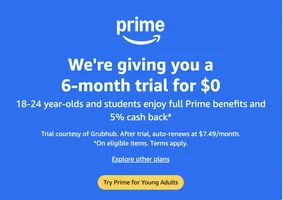 jul 2025If you're 18–24 or a student, you can get a 6-month Amazon Prime membership for FREE, plus 5% cash back daily and 10% cash back on Prime Day with an eligible Prime Student credit card. After the trial, membership is just $7.60/month.