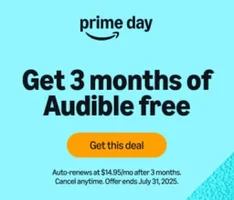 Prime members can enjoy a free 3-month Audible trial if they sign up by July 31, 2025. Audible is a membership service featuring the largest collection of audiobooks worldwide, plus podcasts, exclusive originals, and much more.