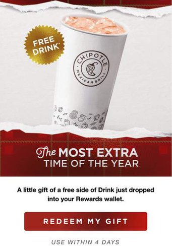 Chipotle is celebrating the season with its “Unwrap Extra” promotion, featuring Buy-One-Get-One entrée deals on the first three Saturdays of December. The promotion is available in-store only, from 4:00 PM until closing.