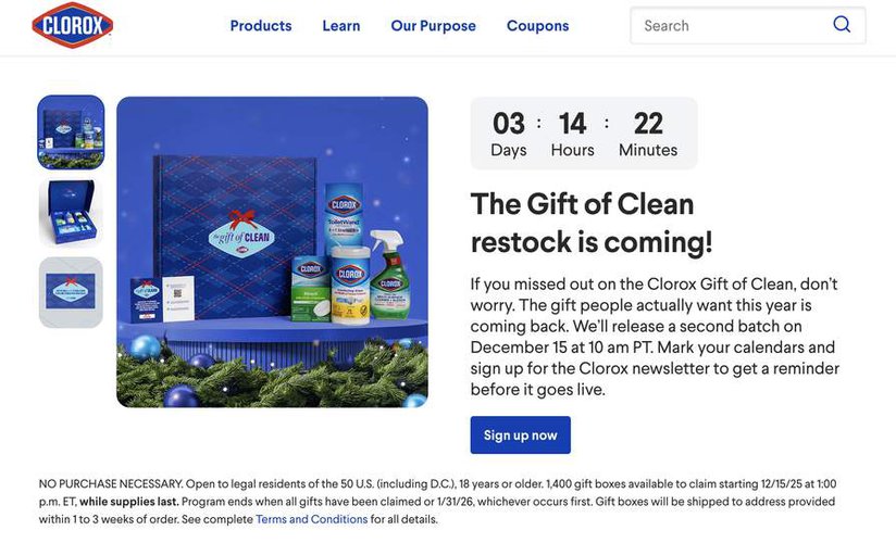 Get set! Clorox is giving away the Gift of Clean to 1,950 winners — a FREE bundle of popular cleaning products, plus a two-hour professional in-home cleaning service booked through Angi. The giveaway goes live on 11/19 and 12/15 at 1pm ET, while supplies last.