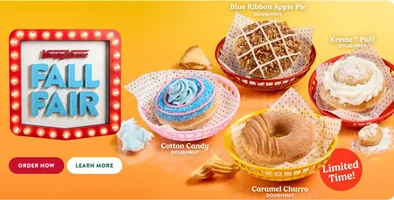 Get a complimentary Fall Fair Doughnut with any purchase at Krispy Kreme now through October 1, 2025! Offer is exclusive to Krispy Kreme Rewards Members—sign-up is free. Valid only at participating shops.
