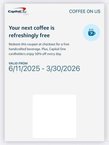 New Capital One drink coupon available, valid through 3/30/26. You can get a free handcrafted beverage at any Capital One Café with no purchase required.