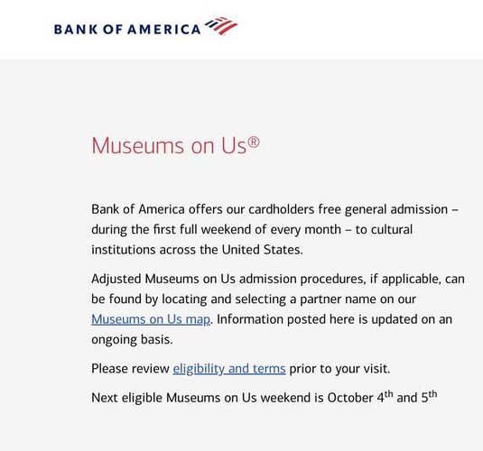 Bank of America’s Museum on Us program provides cardholders with free general admission to more than 225 museums and cultural institutions on the first full weekend of each month. Present your Bank of America debit or credit card along with a photo ID at any participating location to entry for free