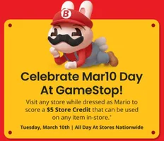 Mario Day is Tuesday, March 10. Visit any GameStop dressed as Mario to receive a free $5 store credit valid on in-store purchases. A special NYC event will attempt the world record for the largest Mario gathering, but the $5 credit promo is available nationwide at participating GameStop locations.