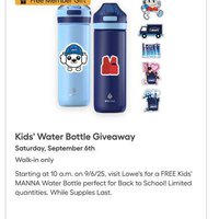Y’ALL DON’T MISS THIS!! Lowe’s is giving away FREE Kids’ MANNA water bottles and stickers on Saturday, September 6th starting at 9AM local time. Be among the first 250 people in-store on 09/06 and scan your member ID!