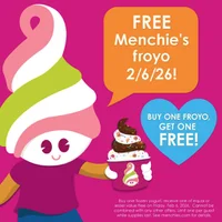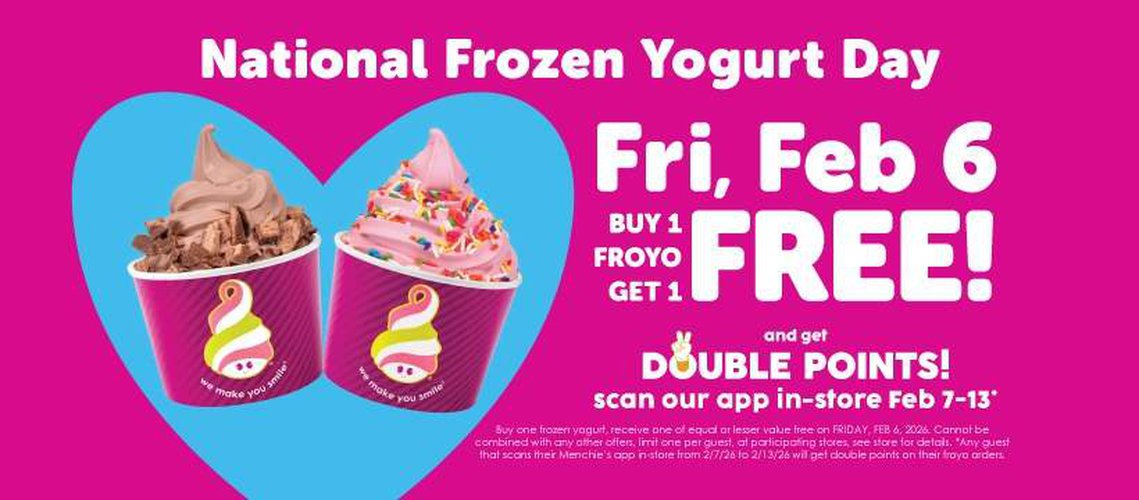 Menchie’s is celebrating National Frozen Yogurt Day with a Buy 1 Get 1 FREE froyo deal on 02/06, in-store only and valid all day while supplies last. Members can scan the app from 02/07–02/13 to earn 2x points. Limit 1 per guest.