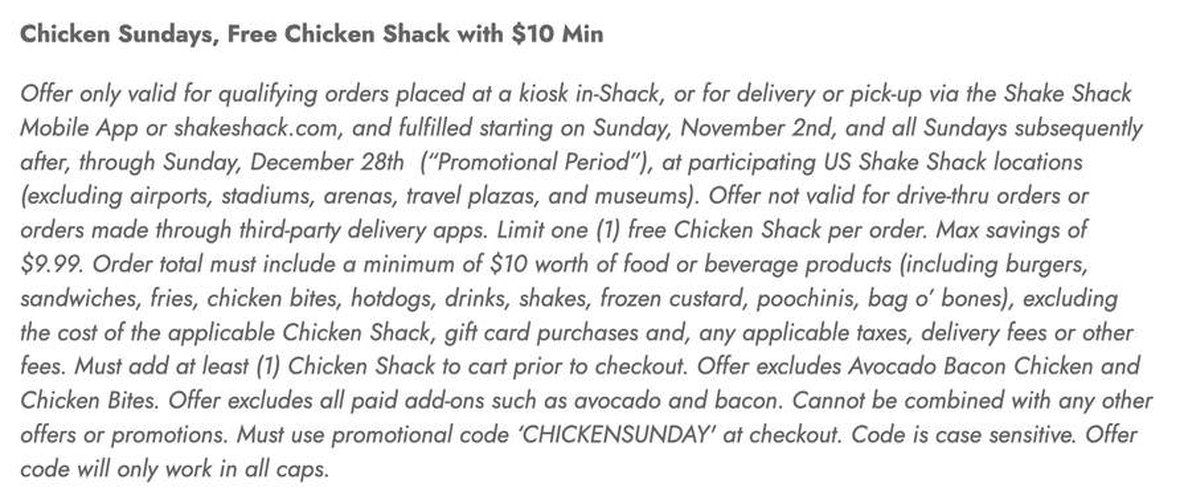 Just spotted a Sunday deal, spend $10 at Shake Shack and get a FREE Chicken Shack sandwich. Simply use the code CHICKENSUNDAY when placing your order through the app, online, or at the in-store kiosk.